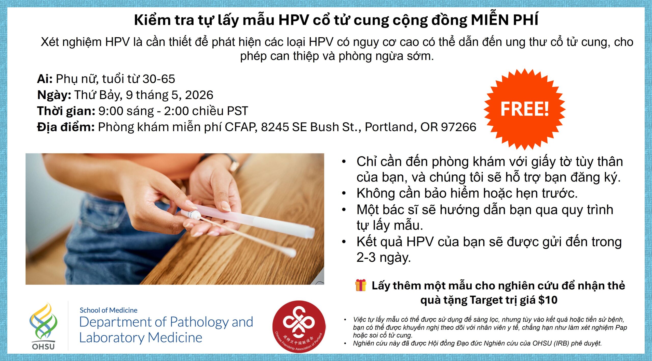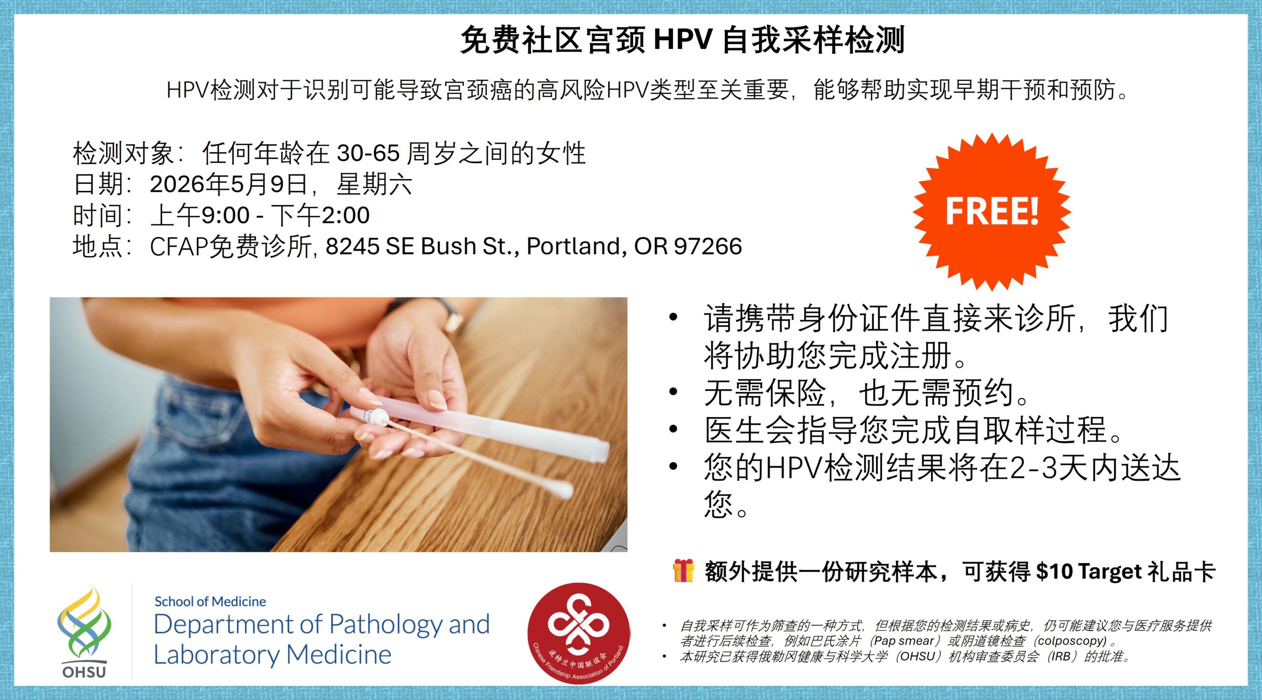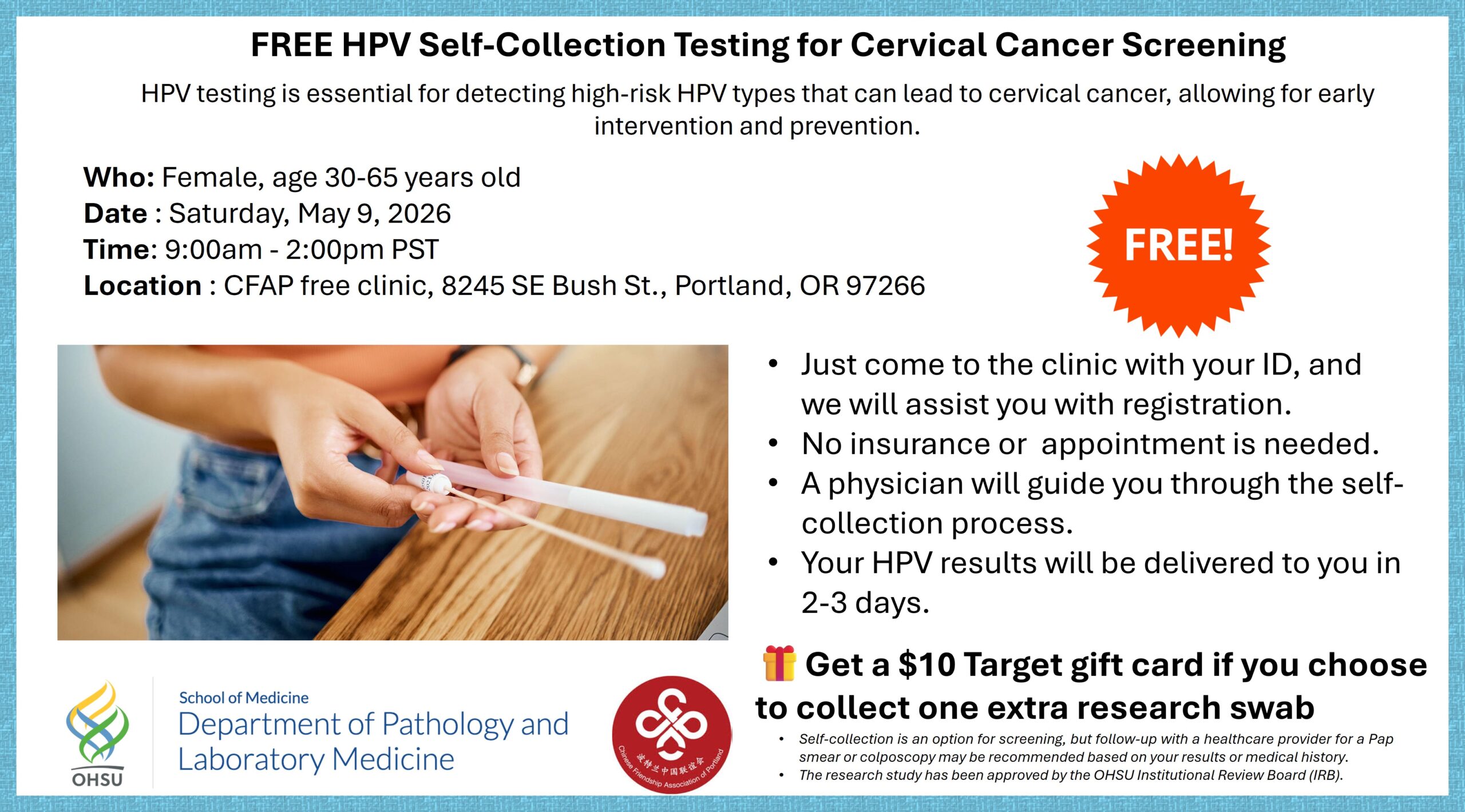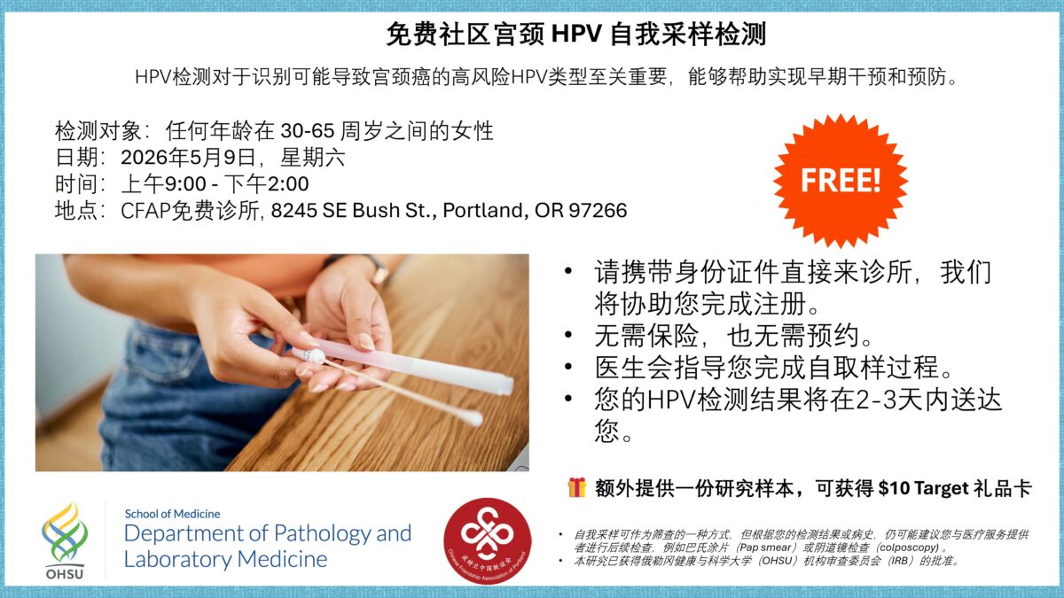 CFAP很荣幸与OHSU病理科合作,推出社区免费宫颈HPV自我采样检测诊所。